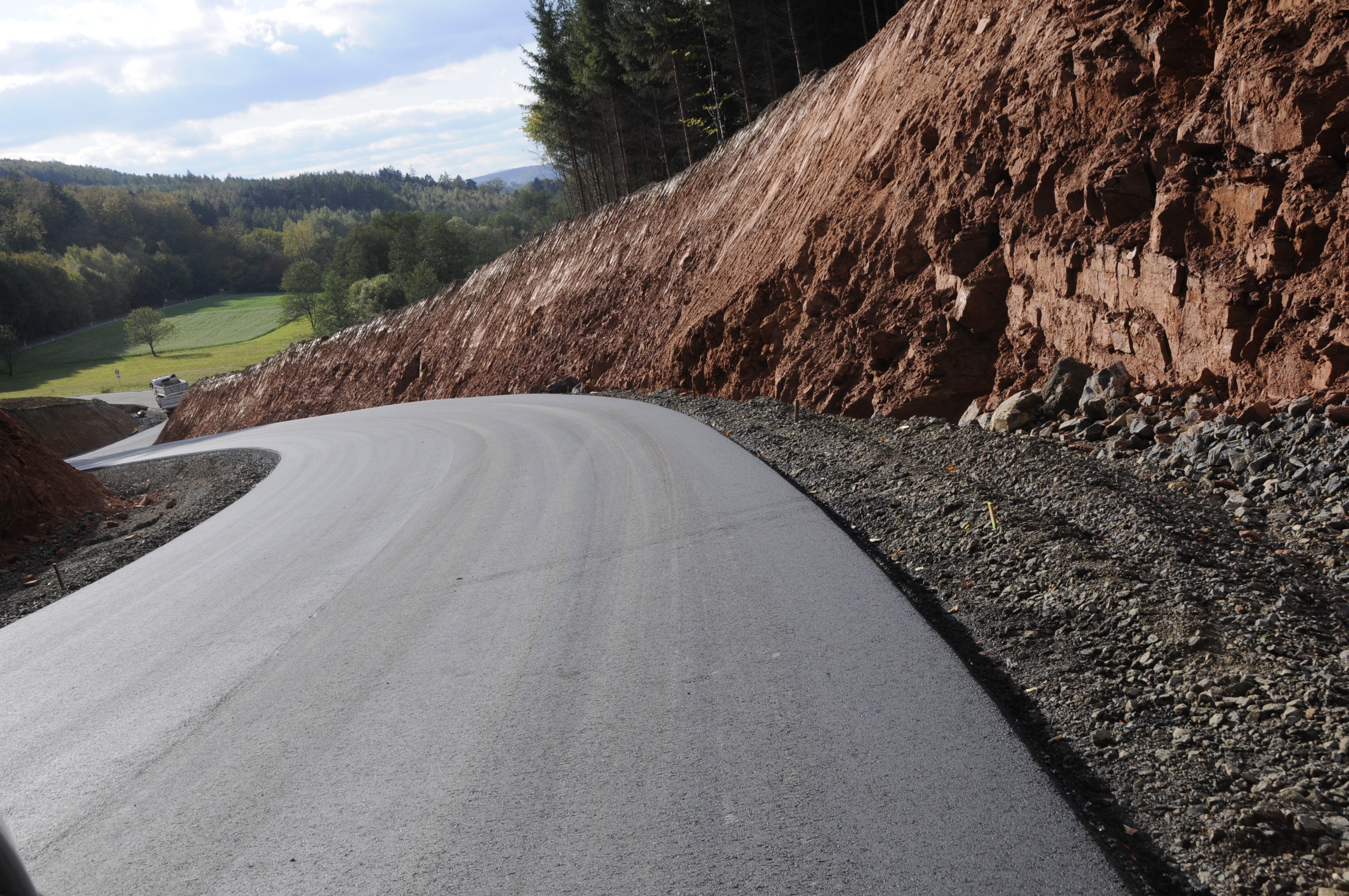 Bau einer neuen Steinbruchzufahrt von 2,5 Kilometer länge Bewegte Erdmassen ca. 170.000 cbm Und anschließender Herstellung des kompletten Straßenunterbaus Mit ca. 40.000 Tonnen Vorbruchmaterial 0 - 200 mm und ca. 25.000 Frostschutz Material 0 -45 mm